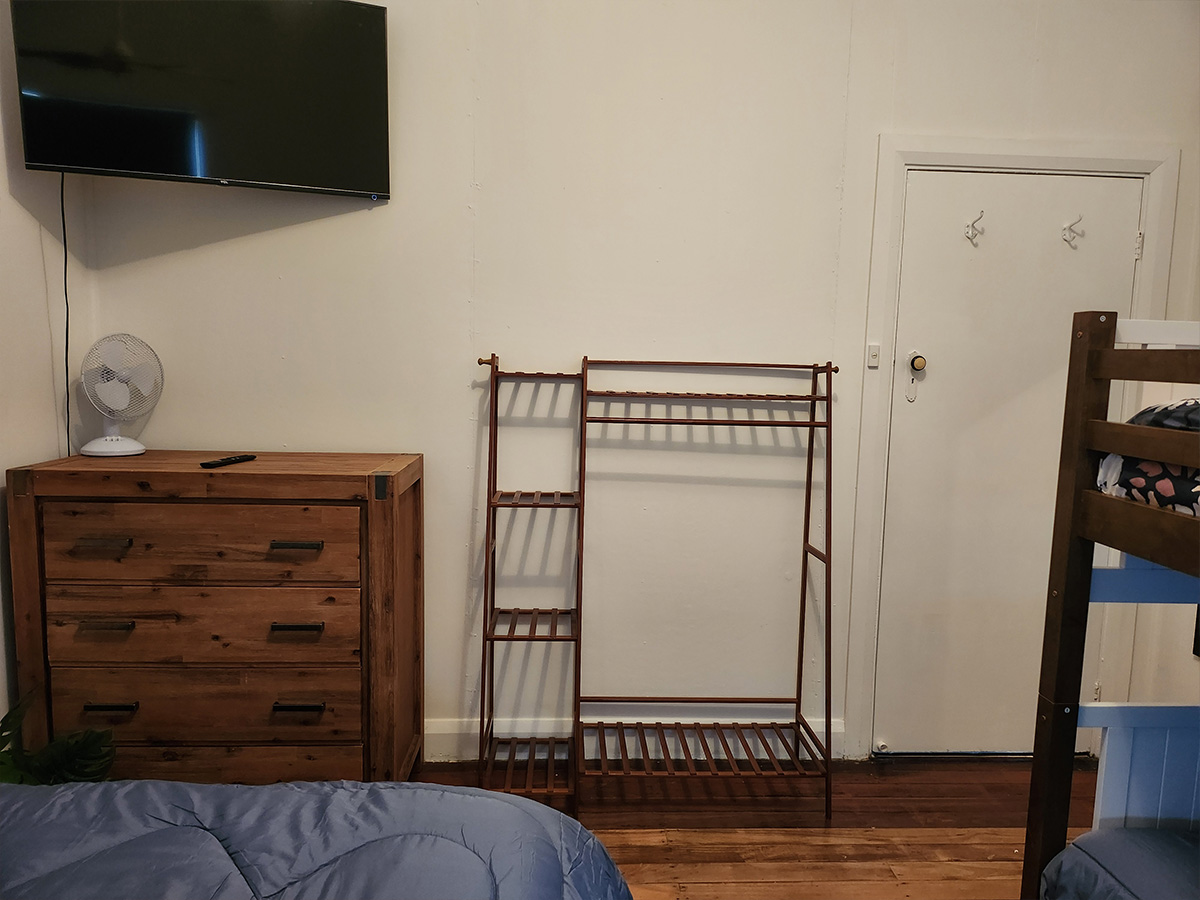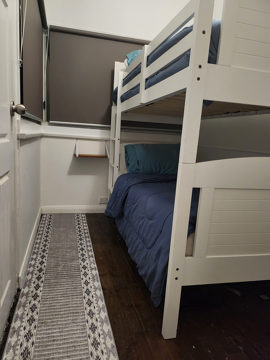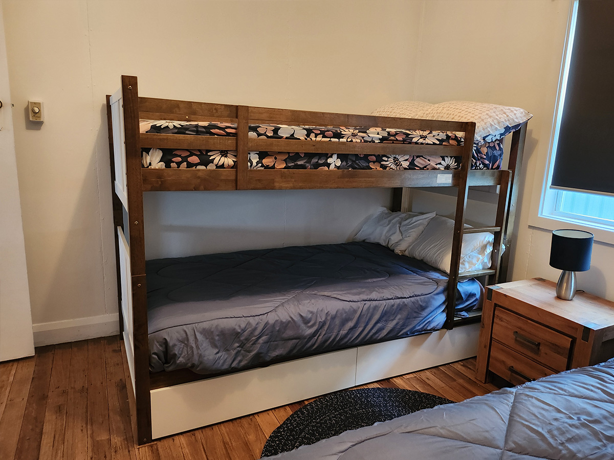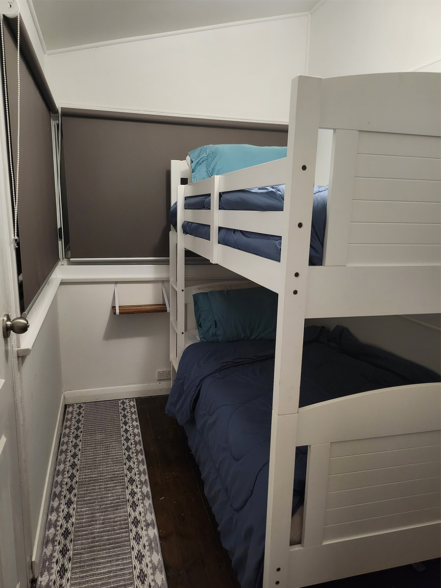 A set of bunks. Double bed on the bottom, single bed on top – cozy and fun for the young ones.